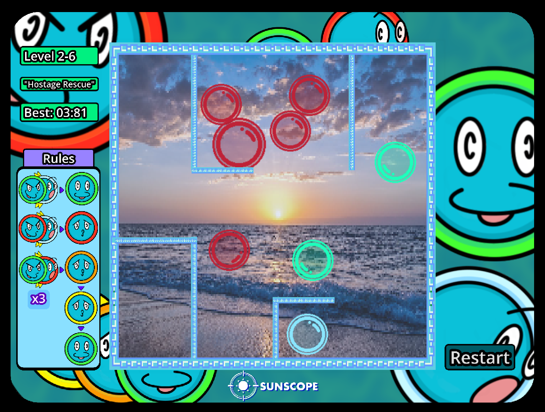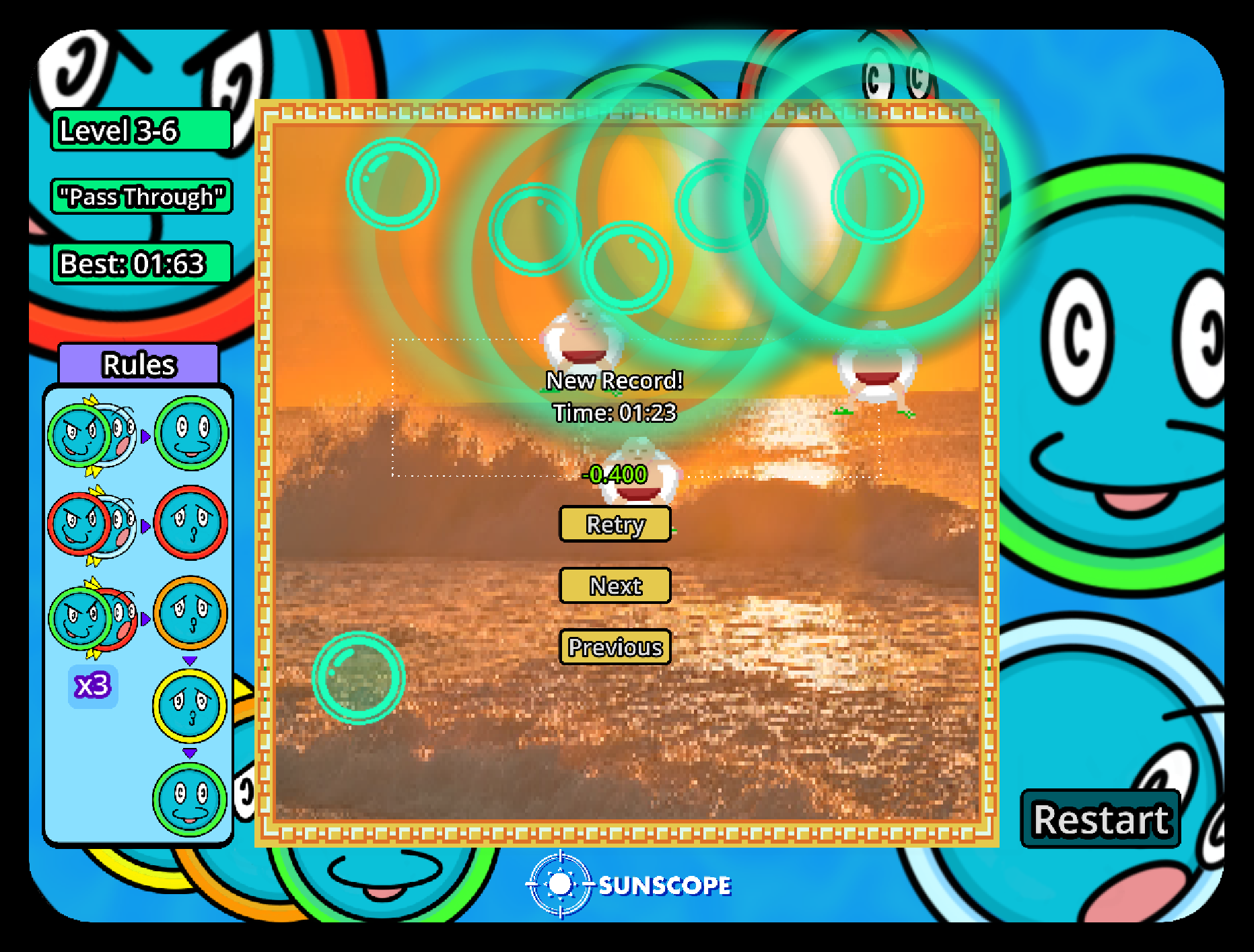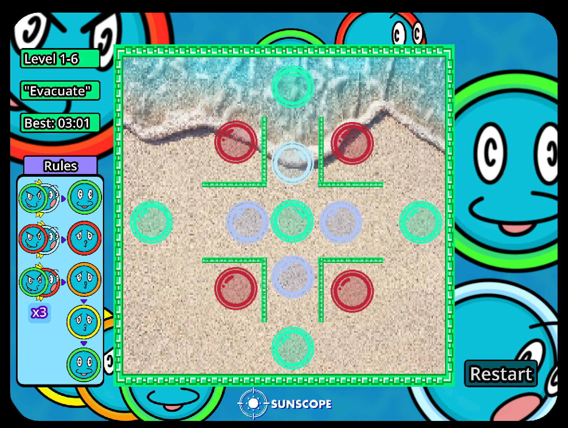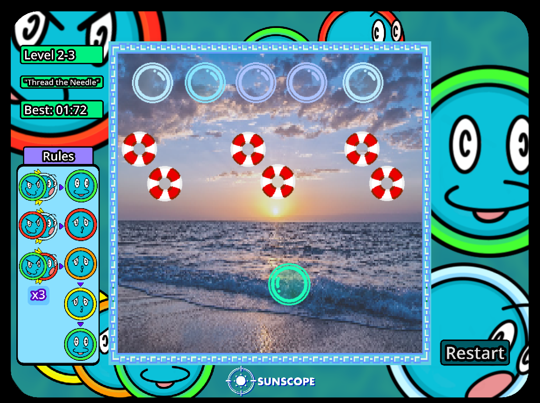 You only get to place one bubble, so choose wisely! Try to get the fastest time as you play across the three different worlds!